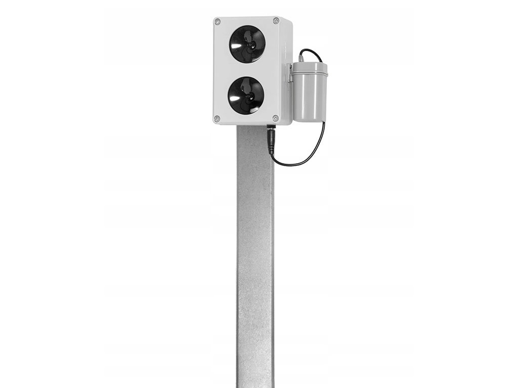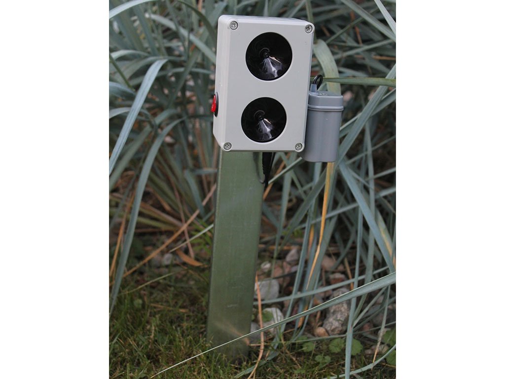 Ultrazvukový odpudzovač zveri, bezpečný pre človeka i domáce zvieratá, vhodný na plašenie kún a hlodavcov, vo vnútorných i vonkajších priestoroch, s odolným vodotesným krytom, na uchytenie cez magnetický držiak, s rozsahom tónu v uhle 180°, s automatickou zmenou kmitočtu, s dosahom až 2500 m2, s napájaním cez 4xAA batérie, s 2 x 50 mm membránovým reproduktorom, s rozmermi 120x85x55mm.