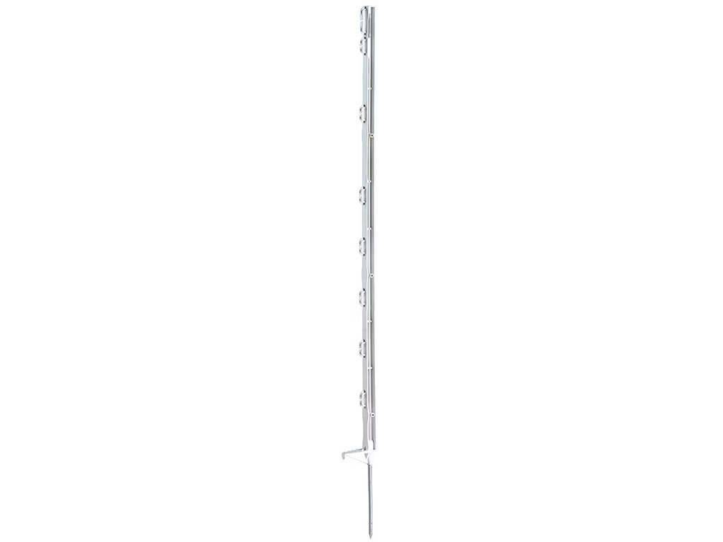 Plastový stĺpik, pre elektrický ohradník, využitie pre drôty, pásky, lanká, jednostranný nášľap, pozinkovaný hrot, dĺžka hrotu 18 cm, celková dĺžka 105 cm.