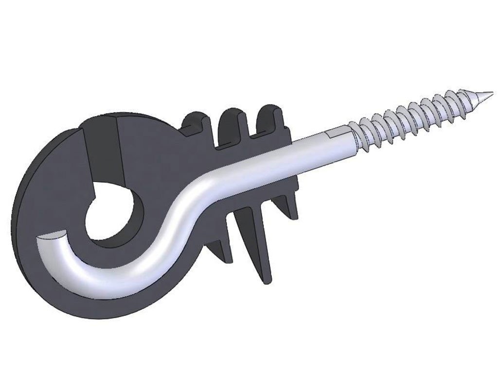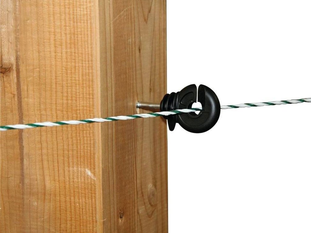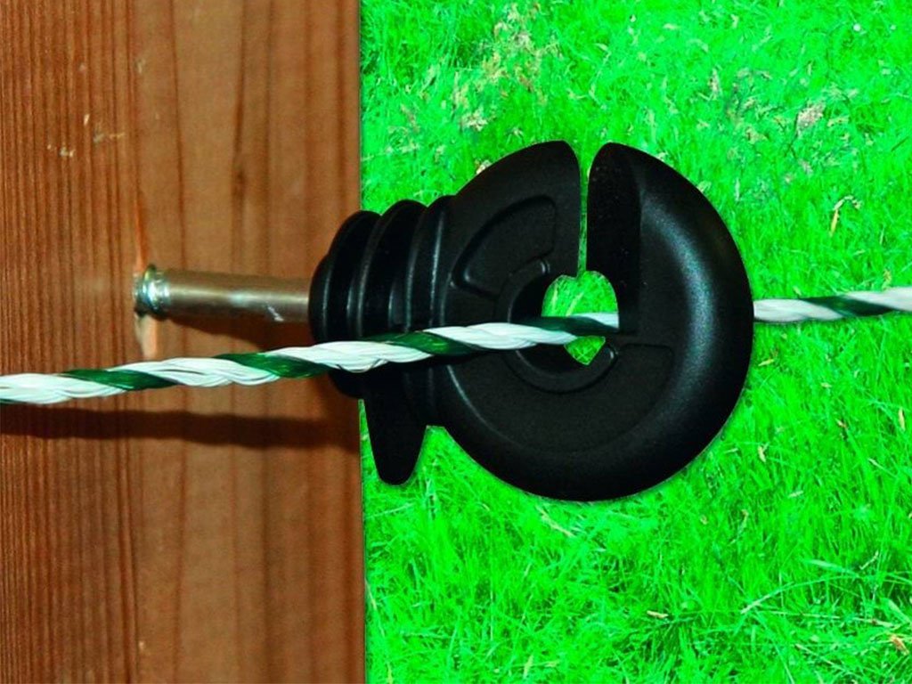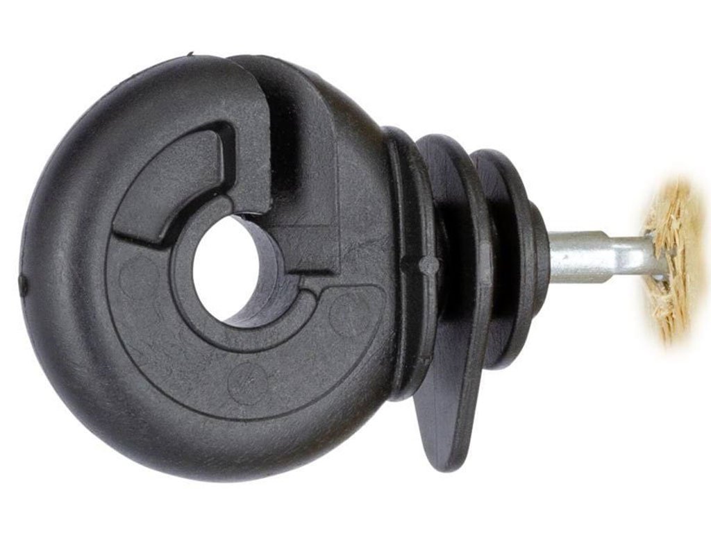 Kruhový izolátor, pre elektrický ohradník, pre drôt, lanko alebo pásku, s pozinkovanou skrutkou, zosilnené steny a izolačný golier, priemer 5,3 mm.
