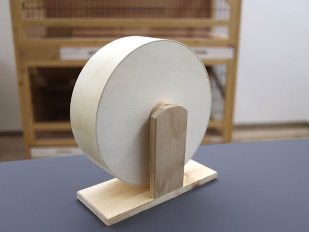 Kolotoč pre škrečky a malé hlodavce,z dreva so širokou základňou, korková vrstva vo vnútornej ploche, uzavretá zadná stena, rozmery 24,5x22x5,8 cm, priemer 22 cm.